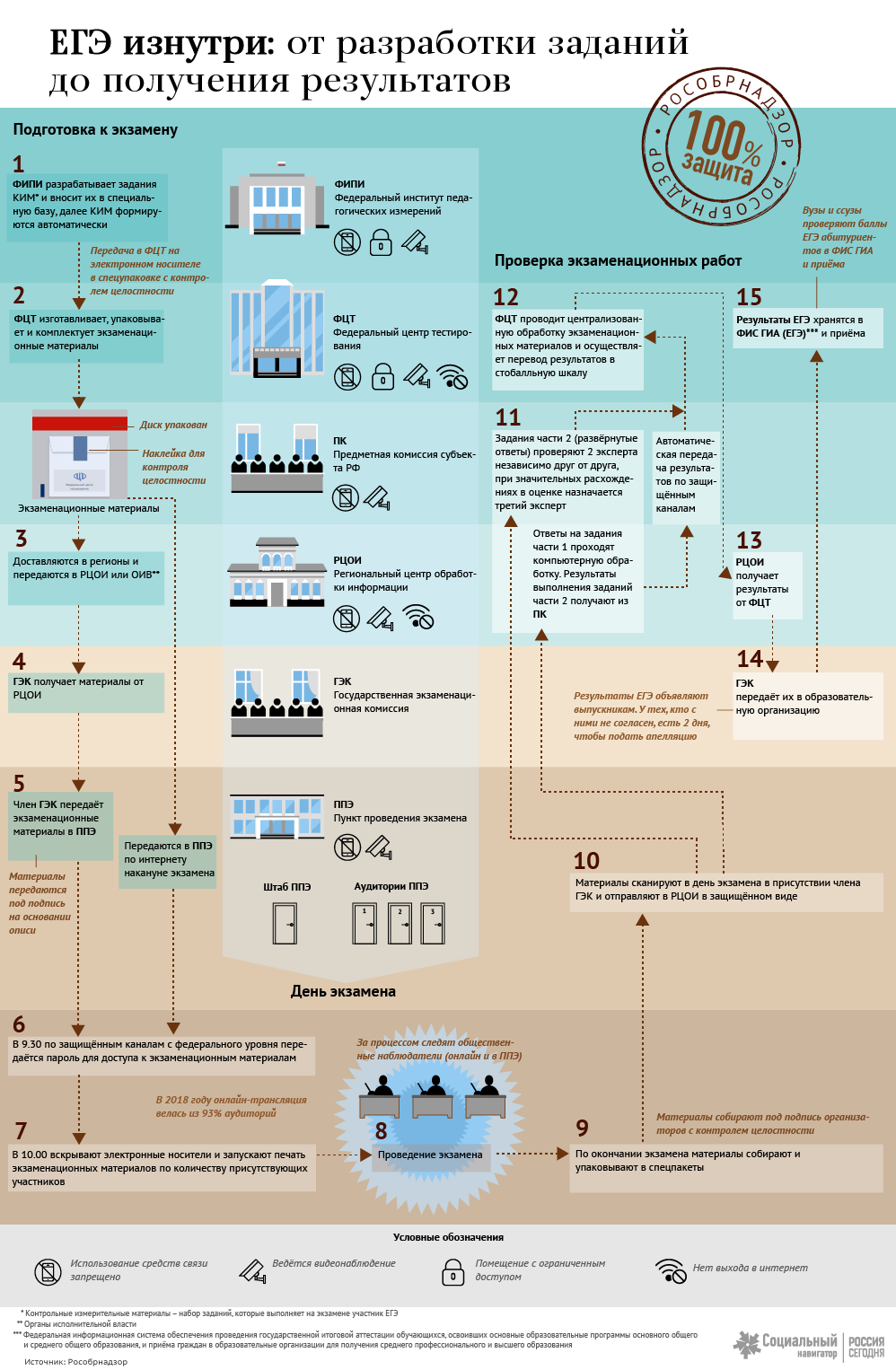 Процедура ЕГЭ ежегодно совершенствуется. Этапы подготовки и проведения экзаменов обеспечены необходимыми мерами защиты, процесс контролируется несколькими профильными организациями. Актуальные данные Рособрнадзора о ЕГЭ представлены в инфографике "Социального навигатора" МИА "Россия сегодня".