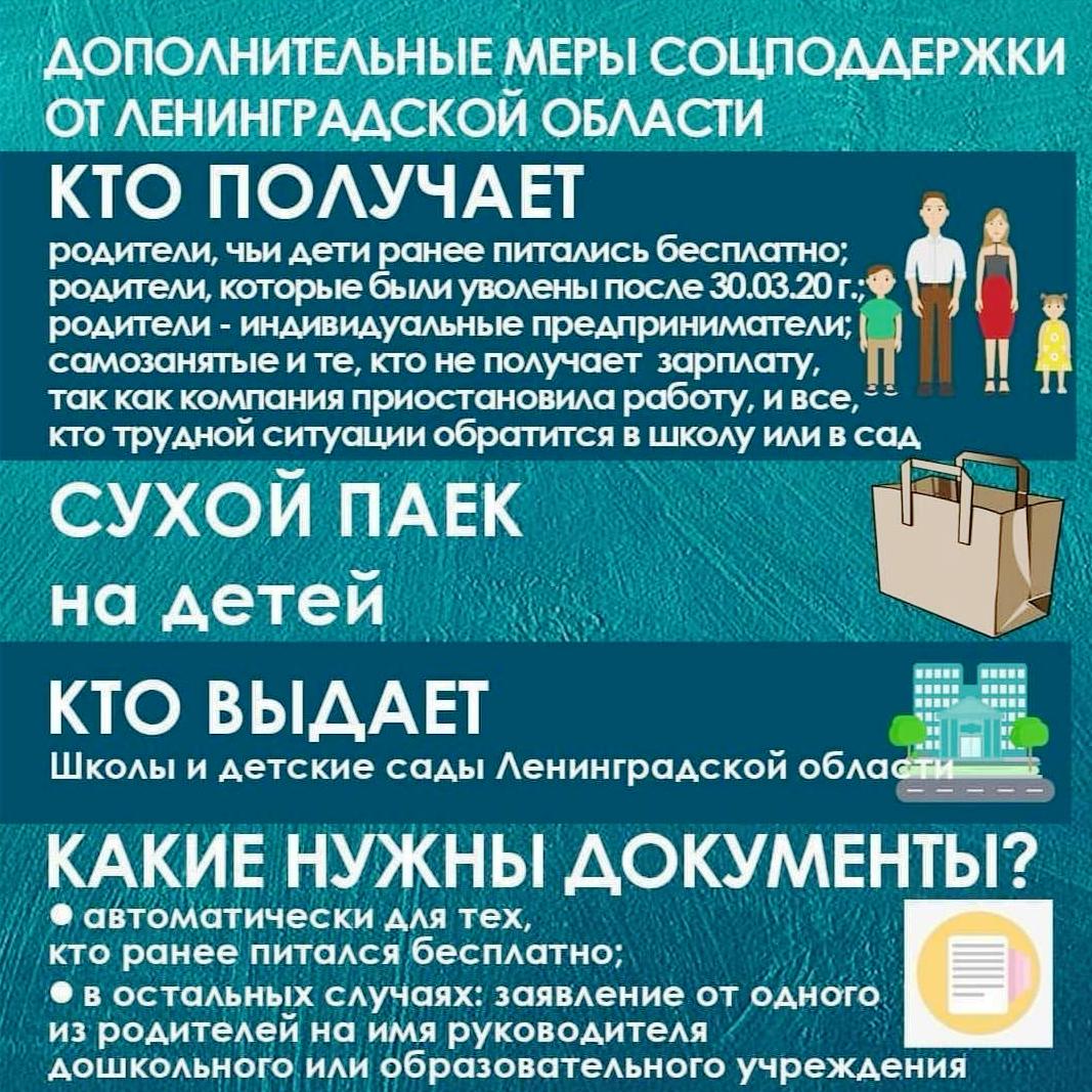 Если ваш ребенок оказался в трудной жизненно ситуации, связанной с распространением новой коронавирусной инфекции (COVID-19) (родители потеряли работу или работодатель отказывает в выплате заработной платы), то Вы сможете получить набор пищевых продуктов (сухой паек).