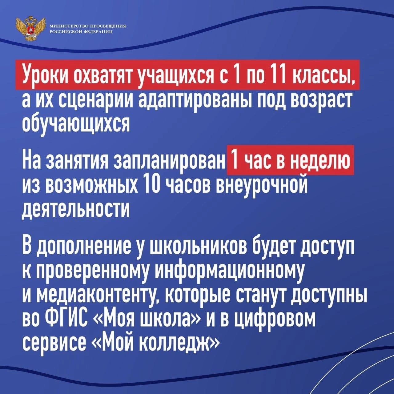 Во всех школах страны учебная неделя будет начинаться с классного часа «Разговор о важном», посвященного самым различным темам, волнующим современных ребят. Центральными темами «Разговоров о важном» станут патриотизм и гражданское воспитание, историческое просвещение, нравственность, экология и др.