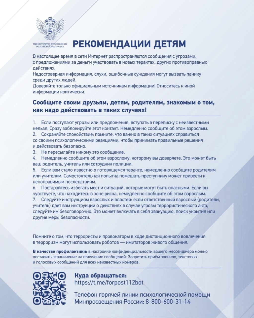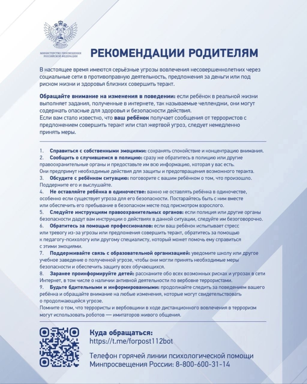 В целях противодействия вовлечению детей в террористическую деятельность в сети и мессенджерах, Минпросвещения России разработало соответствующие рекомендации.