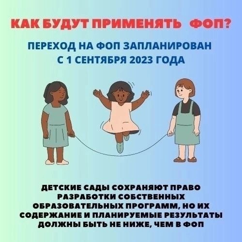 ФОП станет основой для разработки образовательной программы детского сада. Детские сады сохраняют право разработки собственных образовательных программ, но их содержание и планируемые результаты должны быть не ниже, чем в ФОП.