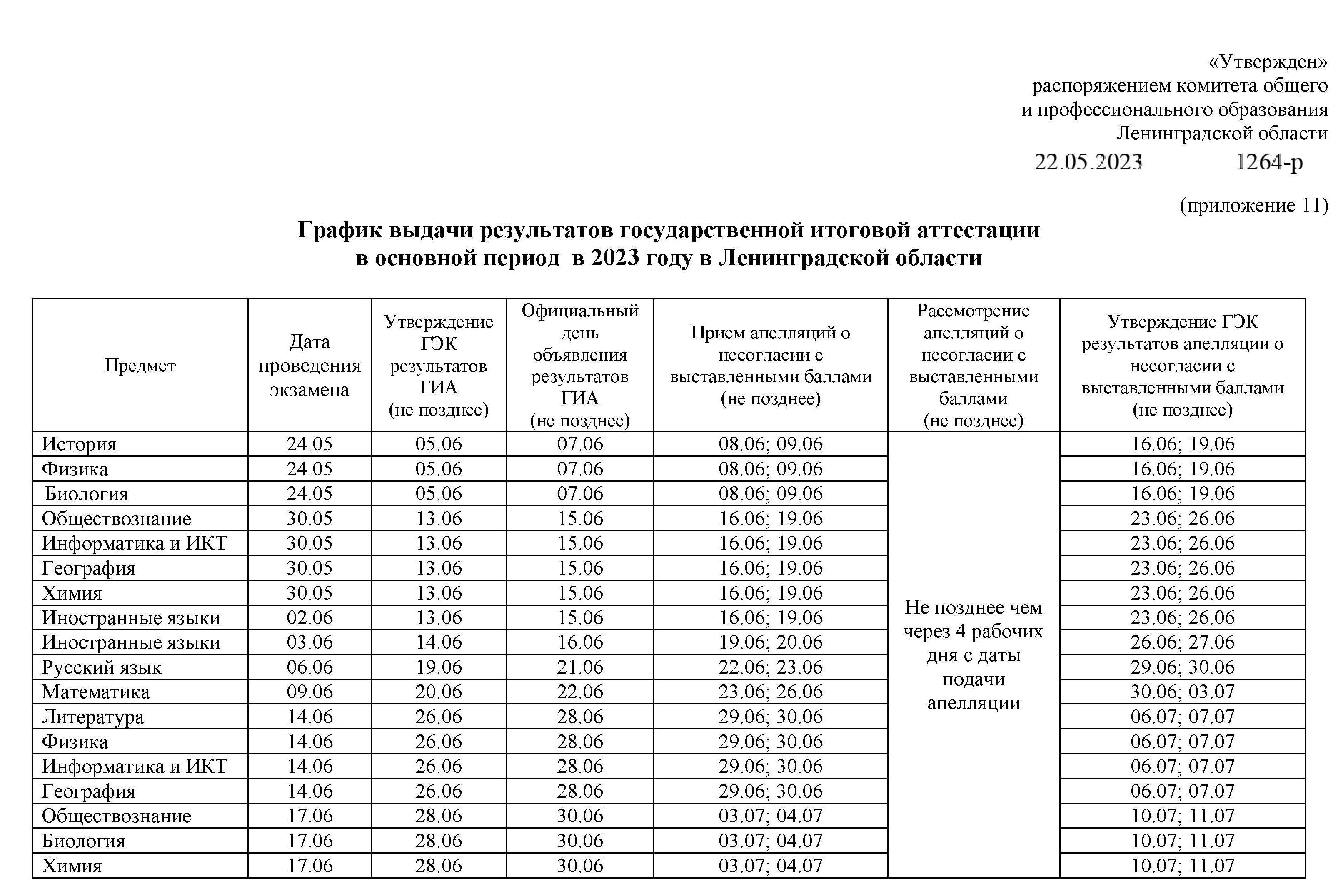 График выдачи результатов государственной итоговой аттестации в основной период в 2023 году в Ленинградской области