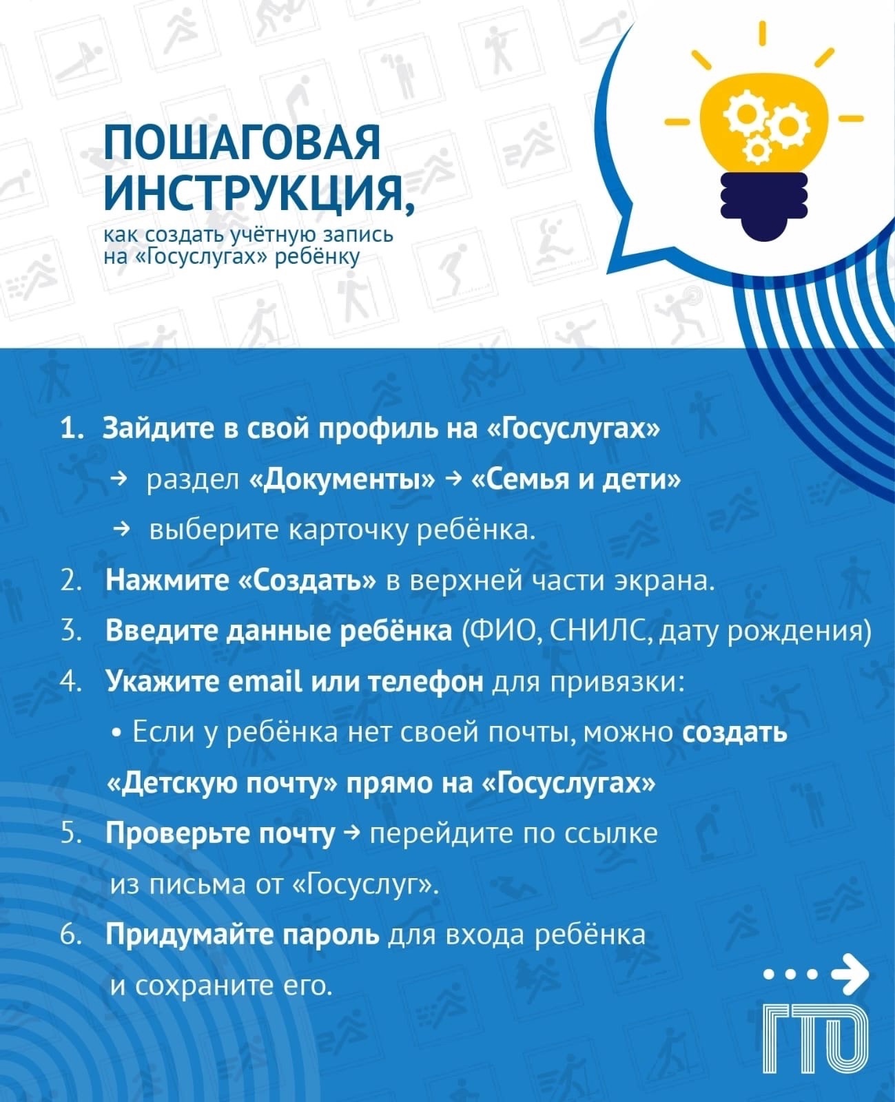 После выполнения инструкции ваш ребёнок получит доступ к своему личному кабинету на сайте GTO.ru 👍